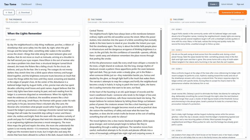 The result is story output with structural specificity that I’m fairly certain vanilla prompting can’t yet reproduce. TauTome already completed one 47,000-word YA dystopian novel. It’s getting better.