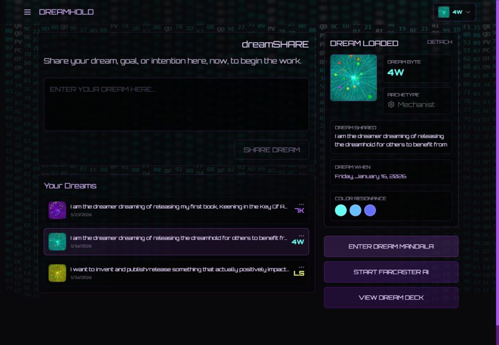 When you enter dreamHOLD, you’re asked to articulate your dream. Not in detail — just the seed. A sentence. Mine was: “I am the dreamer dreaming of releasing the dreamHOLD for others to benefit from.”
