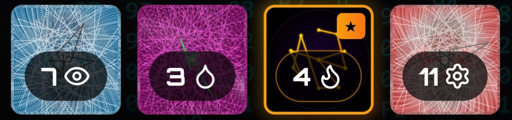 When you complete a session, you’re rewarded with cards based on the spokes you resolved — the archetypal coordinates you successfully reached. Each card carries a face value (1-11) and a suit (one of the eleven archetypes). A 4 of Oracles. A 7 of Architects. An 11 of Weavers.