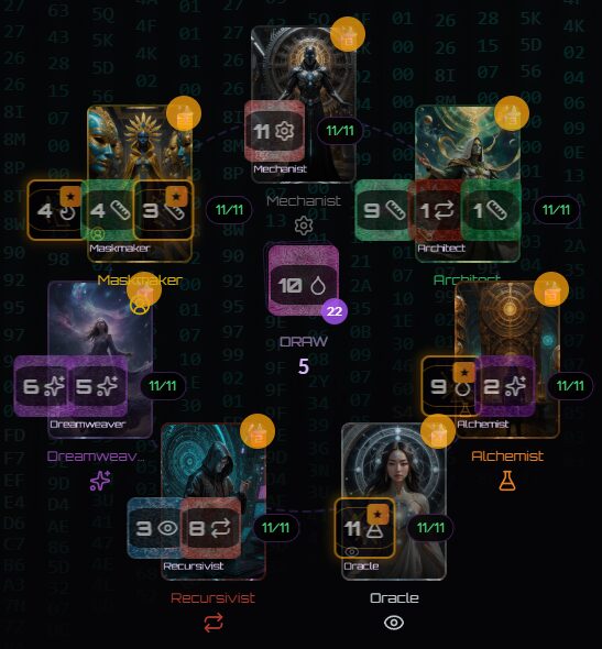 You play your deck against the archetypes, trying to achieve “gnosis” — moments of alignment where your cards and the archetypal forces reach equilibrium. The mechanics are simple enough to learn in minutes, deep enough to reward repeated play.